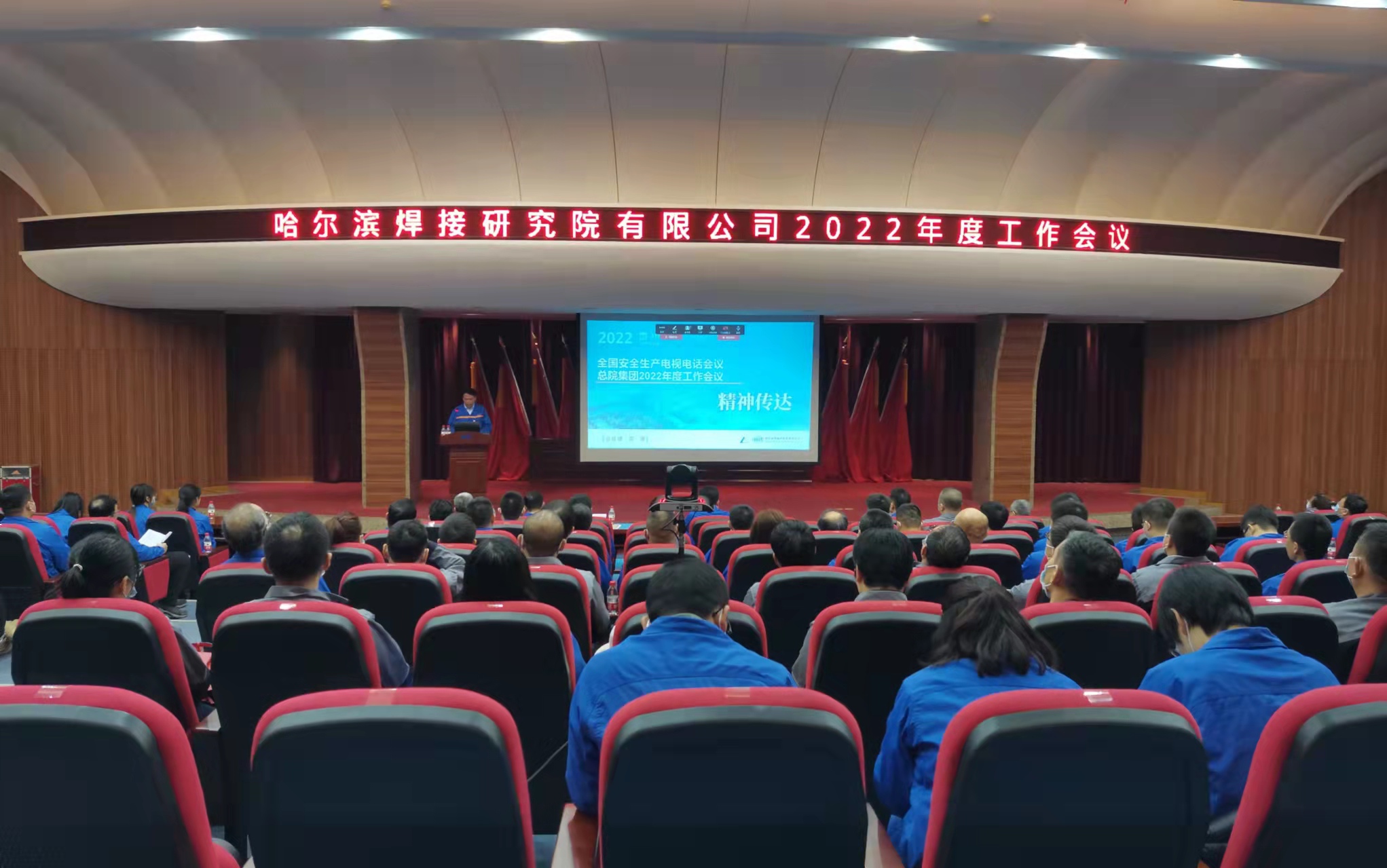 哈焊院中層干部、各黨支部書記及委員、各分工會主席、團委書記及各團支部書記、職能部門全體員工、部分業務部門科室負責人、部分職工代表共計100余人參加會議。哈焊國創公司、哈焊所華通公司分別在青島、常州視頻分會場參加會議。